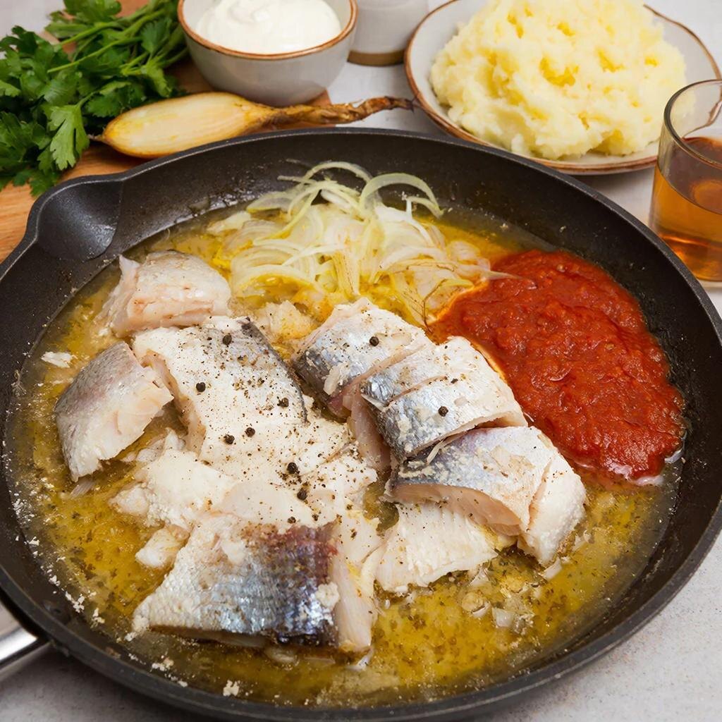 Рыбу разделать на филе с кожей без костей, нарезать кусочками массой 20-30 г., посыпать солью, перцем, обвалять в муке и обжарить. Репчатый лук, нарезанный соломкой, обжарить на масле, добавив в конце жарки томатную пасту. Рыбу, обжаренные лук и томат, ломтики корня петрушки соединить, добавить воду или бульон, тушить до момента размягчения рыбы (15-20 минут), а затем заправить сметаной и специями. Готовый гуляш посыпать мелко нарезанной зеленью, на гарнир подать картофельное пюре. Ингредиенты: на 1 кг. рыбы - 2-3 головки репчатого лука, 1 пучок петрушки, 0,5 стакана растительного масла, 1 ст. ложка томатной пасты, 0,5 стакана муки, 2-3 ст. ложки сметаны, соль, специи