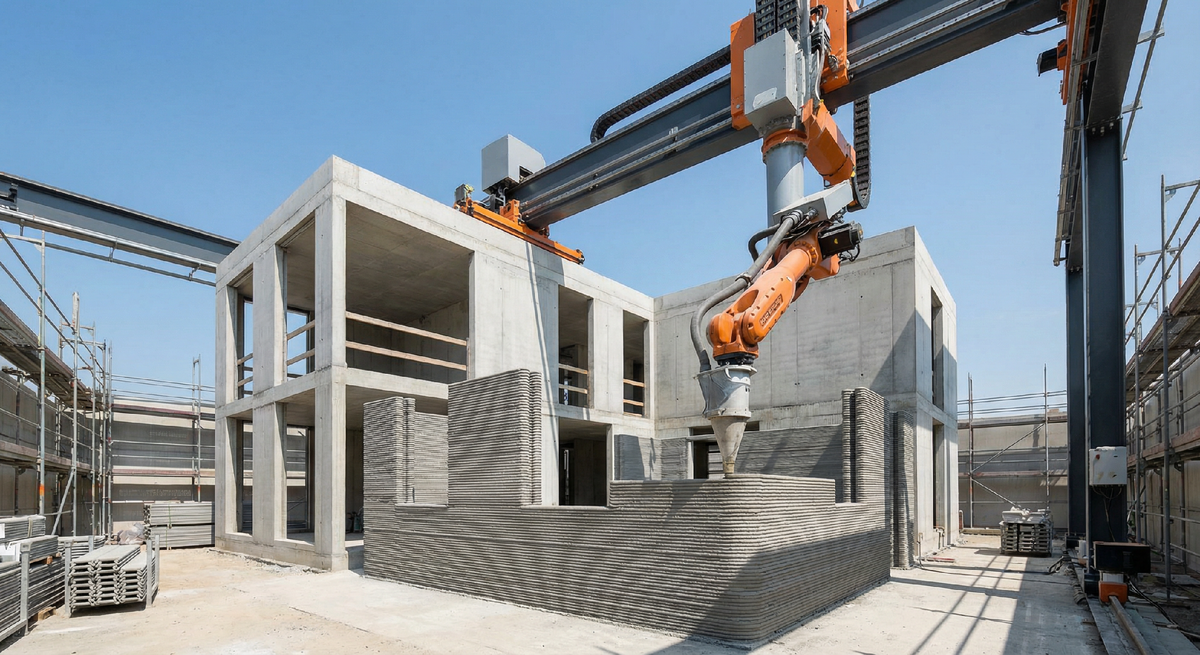 Робот по чертежам «выдавливает» стены слой за слоем. Ему не нужны перекуры, он не ворует цемент и может работать ночью.