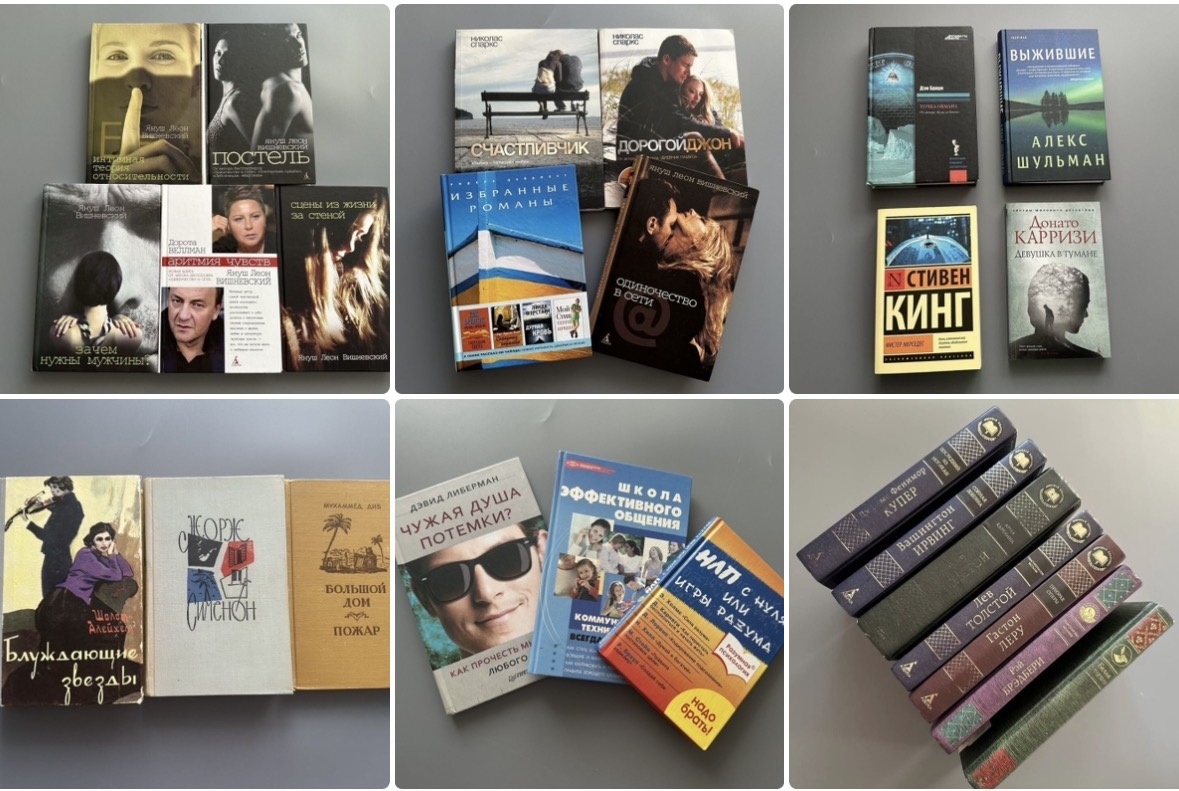Выбирала по тематике, тут у меня романы, триллеры, психология, классика и три книжки ссср 50-60х годов.