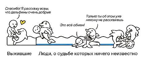 ) Вы наверняка видели заголовки: «Он бросил университет и стал миллиардером!», «Эта девушка похудела на 30 кг, питаясь только шоколадом!», «Дельфины спасли тонущего человека и вытолкали его на берег!». Эти истории вдохновляют, заставляют верить в чудеса и хвататься за рецепт быстрого успеха. Но есть одна проблема. Дельфин, который толкает тонущего к берегу, - лишь одна сторона медали. А как насчет того, кого дельфин толкал в открытое море? Правильно, он ничего не расскажет. Это и есть систематическая ошибка выжившего - когнитивное искажение, при котором мы концентрируемся на людях или вещах, успешно прошедших некий отбор, и игнорируем тех, кто его не прошел. Мы видим только победителей и забываем о «погибших», чей опыт остается за кадром. Мы делаем глобальный вывод о доброте дельфинов, основываясь на выжившем свидетеле. Но мы не учитываем миллионы лет эволюции, статистику нападений или, как в этой аллегории, тех, кто не вернулся, чтобы дать показания. В реальности у дельфинов (как