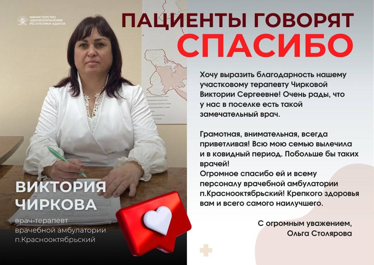 Слова благодарности для медика — это самая высокая оценка труда и стимул дальнейшего развития. Сегодня пациент говорит спасибо врачу-терапевту врачебной амбулатории п.Краснооктябрьский — Виктории Чирковой и министру здравоохранения Адыгеи Рустему Меретукову за строительство новой, комфортной врачебной амбулатории в посёлке. Хотелось бы лично поблагодарить министра здравоохранения за прекрасную врачебную амбулаторию, которую нам с этого года предоставили в пользование нашим посёлкам Майкопского района! Современно, удобное местоположение, прекрасная мебель, оборудование, - отметила женщина. Смотрите карточку ⬆