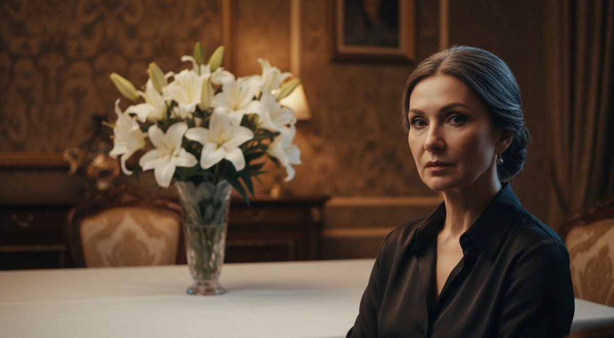 Cover prompt: A 57-year-old Russian woman with refined features, silver-streaked dark hair pulled back elegantly, sitting at a beautifully set dining table with white lilies in a vase, her expression composed but with a hint of inner conflict. She wears a classic dark blouse. The setting is an upscale Russian home interior with warm amber lighting. Cinematic photography, shallow depth of field, sophisticated and emotionally complex atmosphere.