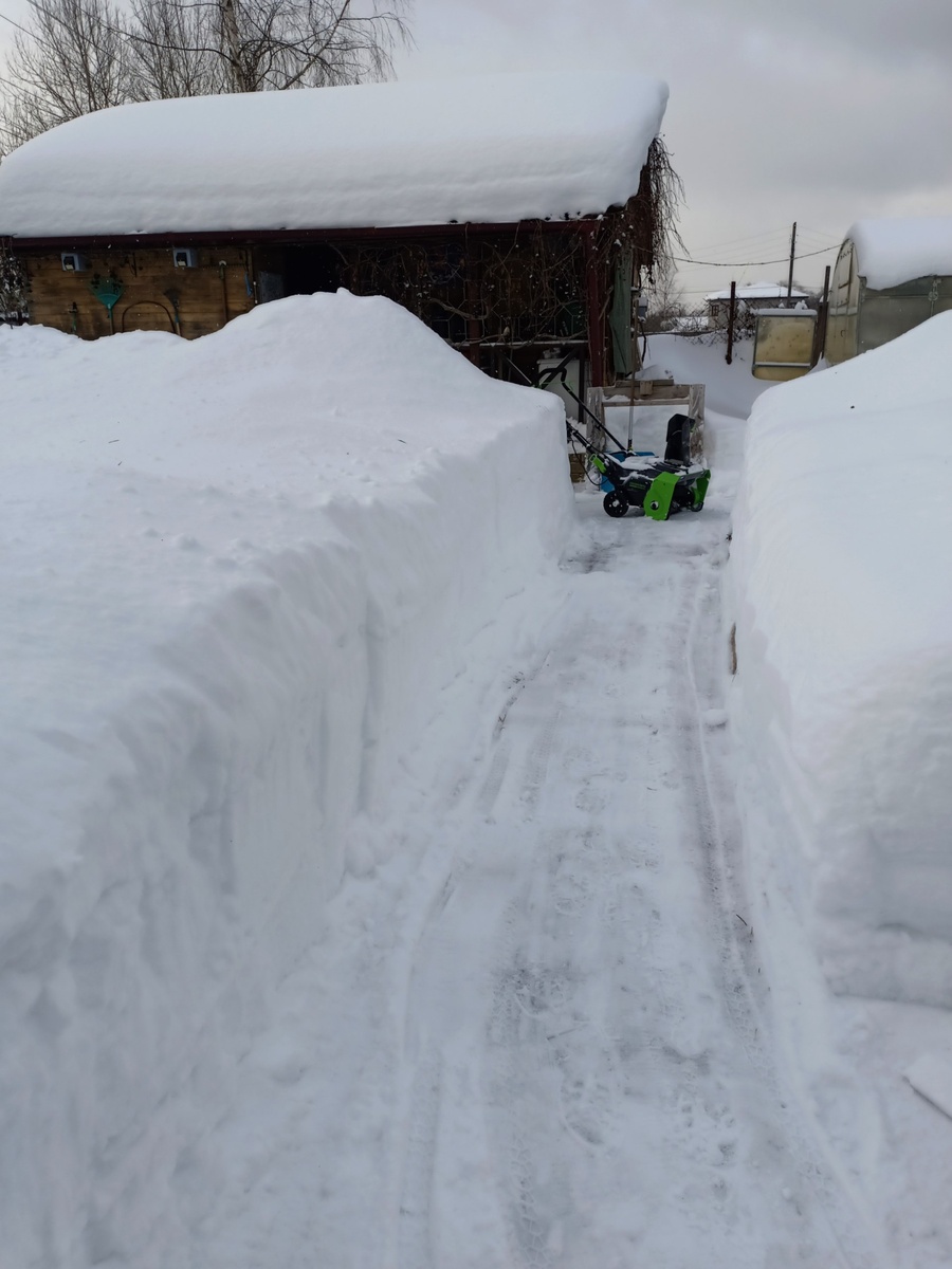Если узкая тропинка, то нести что-либо практически невозможно. Теперь тут ходить фривольно можно. Снег скидываю лопатой на расчищенное и после снегоуборщиком выкидываю далеко в сторону. Так практично, эффективно и работает... что-то я о завтраке забыл. Аккумулятор сядет, как раз и пойду.