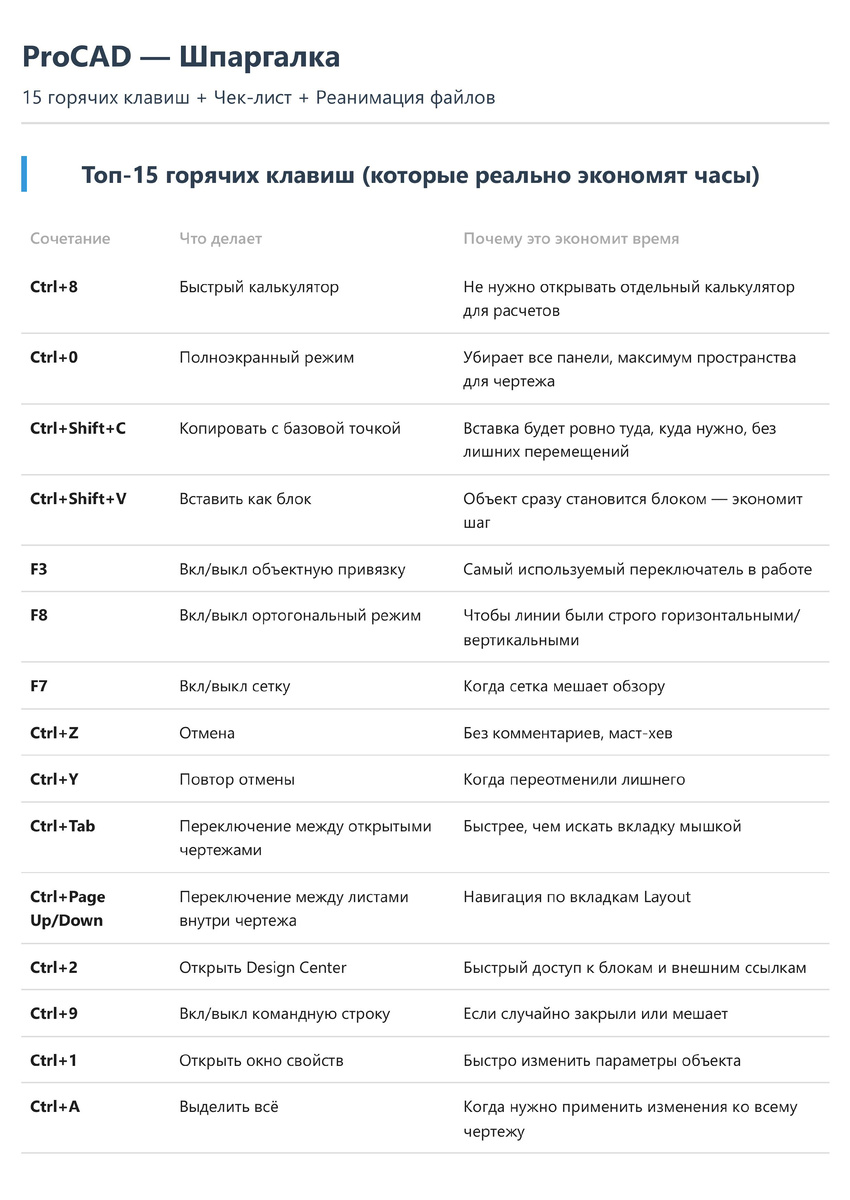 Всё, что нужно для уверенной работы в программе. Здесь не учат нажимать на кнопки — здесь помогают разобраться в логике программы и рабочих процессах. 🔹 Приемы и лайфхаки — не теория, а то, что реально работает в боевых проектах 🔹 Разборы сложных моментов — ищем решения вместе, без воды и занудства 🔹 Новости AutoCAD — коротко о главном, чтобы быть в курсе Бесплатные материалы по ссылке — забирайте, пригодится: ProCAD — Памятка Подписывайтесь. Результат без лишних движений. ProCAD School — Подписаться