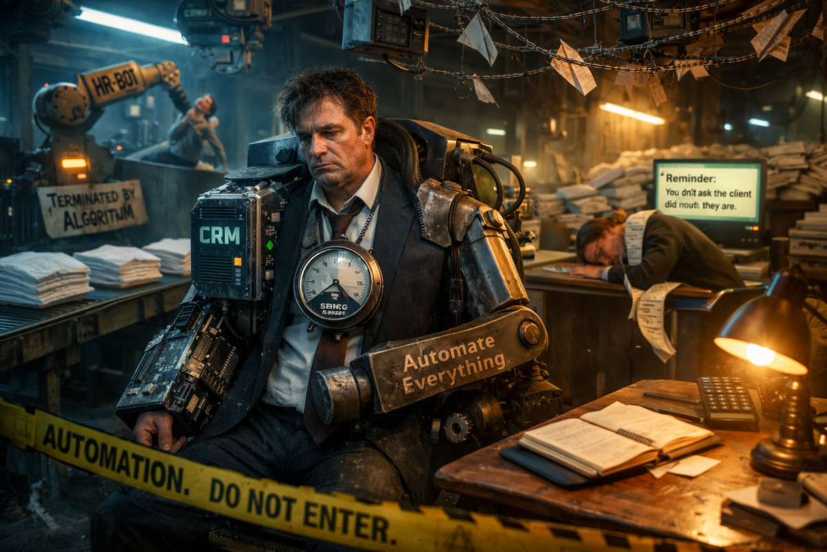 Вы срываете сроки, теряете сотрудников и вините CRM. Но проблема не в софте. Вы автоматизировали то, что должно было остаться в Excel или на словах. В прошлом году ко мне пришел владелец сети химчисток. Гордо показал дашборд: каждый чих сотрудника фиксируется в системе, загрузка оборудования — в реальном времени, KPI операторов считаются автоматически. — Внедрили всё, что советовали. А прибыль упала. Люди бесятся, клиенты жалуются. Я посмотрел на процессы. И увидел классику: ребята автоматизировали даже увольнения. Система сама формировала акт при дисциплинарном нарушении и отправляла HR. Без личного разговора. Без контекста. Просто «по алгоритму». Трое ключевых сотрудников уволились за месяц. Их не спросили. Только то, что работает как конвейер. Однотипно, предсказуемо, в больших объемах. 1. Массовые однотипные операции