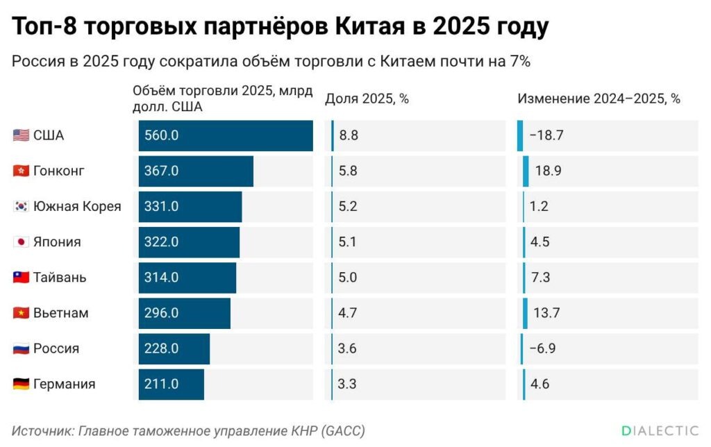 Внешнеторговый оборот Китая в 2025 году составил более 6,35 трлн долларов, продемонстрировав устойчивость основных логистических цепочек. Это следует из данных Главного таможенного управления КНР. Соединенные Штаты сохранили статус ключевого партнера Пекина с оборотом почти в 560 млрд долларов и долей 8,8% в общем объеме сделок. Россия в рейтинге крупнейших контрагентов заняла седьмое место. По итогам года объем двусторонней торговли составил 228,1 млрд долларов, что соответствует 3,6% от совокупного китайского оборота. Взаимоотношения Москвы и Пекина в минувшем году характеризовались первым за пятилетие снижением активности: товарооборот сократился на 6,9% в сравнении с 2024 годом. Среди региональных блоков лидирующую позицию заняла Ассоциация государств Юго-Восточной Азии, объем торговли с которой превысил 1 трлн долларов. На долю Европейского союза пришлось еще 828 млрд долларов. При этом страны, ставшие партнерами КНР по стратегической инициативе «Один пояс — один путь», сформирова