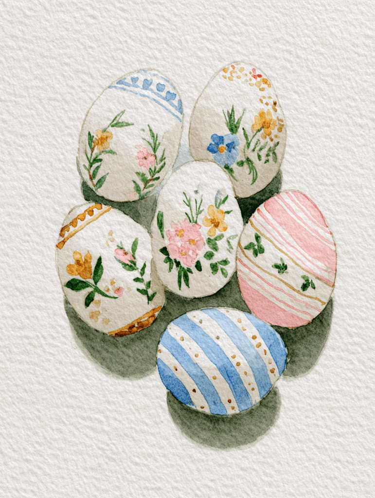 Пасха - прекрасное время, чтобы нарисовать акварельные картины: нежные цвета, свежие цветы и игривые весенние детали делают её идеальным сезоном для творчества. Рисуете ли вы для удовольствия, делаете открытки ручной работы или просто заполняете свой скетчбук чем-то радостным, акварельные проекты на пасхальную тематику - это лёгкое, радостное и расслабляющее занятие. Начните с нестареющей классики — украшенных пасхальных яиц . Раскрасьте группу яиц в нежных пастельных тонах и поэкспериментируйте с различными узорами, например: Акварель идеально подходит для создания мягких переходов и многослойной прозрачности, благодаря чему каждое яйцо выглядит уникальным и словно создано вручную. Это отличное разминочное упражнение как для начинающих, так и для опытных художников. Отпразднуйте наступление весеннего сезона с помощью цветочного венка из нарциссов, тюльпанов, крокусов и вишневых цветов. Используйте свободные, выразительные мазки, чтобы венок выглядел свежим и воздушным, а не перегружен