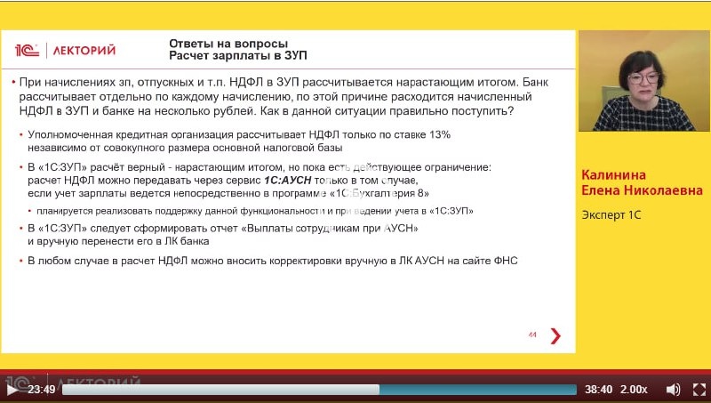 п. НДФЛ в ЗУП рассчитывается нарастающим итогом. Банк рассчитывает отдельно по каждому начислению, по этой причине расходится начисленный НДФЛ в ЗУП и банке на несколько рублей. Как в данной ситуации правильно поступить? на этот и другие вопросы ответила Елена Калинина, эксперт 1С в лекции на тему АУСН: практика применения, ответы на часто задаваемые вопросы 👉 Смотрите бесплатно полную видеозапись лекции 📲 1С:Лекторий в МАХ ❤ 1С:Лекторий в Телеграм