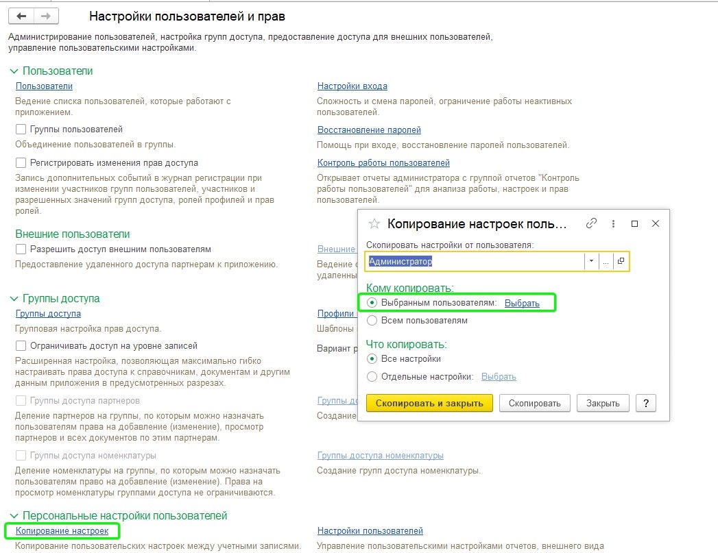 Зачем это нужно? Чтобы быстро перенести одинаковые настройки (интерфейс, отчёты, права) между пользователями без ручного дублирования. Как скопировать за 3 шага? 1️⃣ НСИ и администрирование - Администрирование - Настройки пользователей и прав 2️⃣ Персональные настройки - Копирование настроек 3️⃣ Укажите: · От кого копируем (пользователь-источник) · Кому копируем (один или несколько пользователей) · Какие настройки переносим Важно! ❗ После копирования пользователь должен перезайти в базу - только тогда изменения вступят в силу. Что можно копировать? ✔ Права доступа ✔ Настройки интерфейса ✔ Шаблоны отчётов ✔ Персональные настройки документов Преимущества: ✅ Экономия времени при подключении новых сотрудников ✅ Единый стандарт настроек для отдела ✅ Быстрое восстановление при сбоях 🚀 Готово! Настройки скопированы - новый сотрудник может работать сразу.
