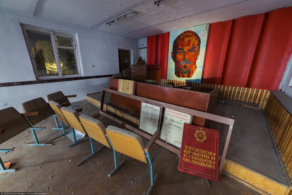 В актовом зале заброшенного заводоуправления на стенах до сих пор видны следы былой идеологии.