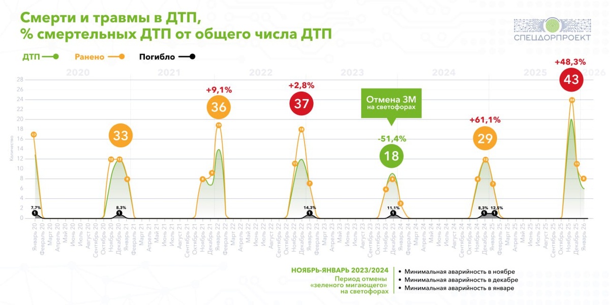 👀 Эксперимент ГКУ ЦОДД и «СпецДорПроекта» по отмене мигающего зелёного сигнала светофора проводился в Зеленограде с октября 2023 года по июнь 2024 года. По данным ГАИ, отмена мигающего зелёного снизила совокупное число пострадавших в ДТП на 51% уже в первые месяцы эксперимента. Летом 2024 года, когда эксперимент был остановлен, аварийность вернулась на прежний уровень. В ноябре 2024 — январе 2025 годов пострадали (в том числе погибли) 29 человек против 18 годом ранее (+61% за три месяца). ❗️За аналогичный период 2025–2026 годов пострадали уже 43 человека! Показатель достиг рекордного значения за последние 6 лет. Вместе с мигающим зелёным вернулись высокие скорости, невнимательность водителей и рекордные цифры травматизма. Ну и, конечно, нештрафуемый порог +19 км/ч вносит свой вклад… ❌ Рост аварийности никого не волнует, главное, чтобы привычное мигание не исчезало, а то, что вместе с ним исчезают люди и их здоровье, замечают, только когда беда касается лично. Что предложите тепе