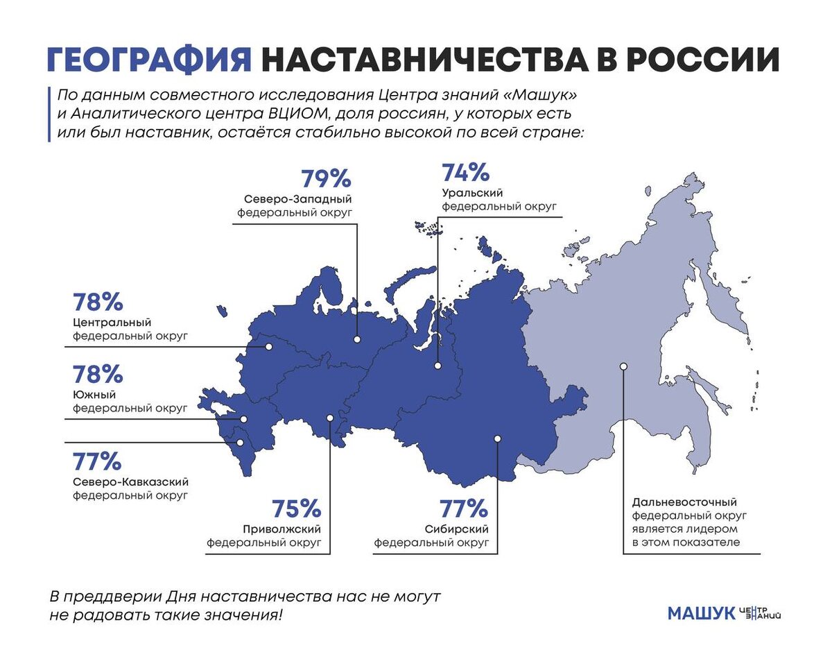 ? 🔍 📌Сейчас наглядно покажем! Среди опрошенных в рамках исследования доля тех, у кого есть или был когда-то наставник, не может не воодушевлять. Дальневосточный федеральный округ впереди России всей! В этом округе число составило 80%! 📎Возможно, ваш наставник тоже включен в эти числа. Не забывайте, что вы можете поблагодарить его так, чтобы увидела вся страна.