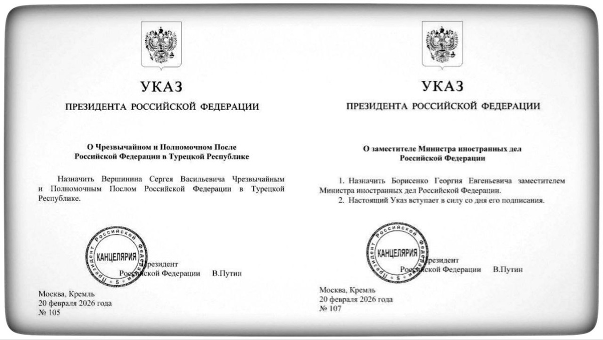Указом Президента Российской Федерации №105 от 20 февраля 2026 года Сергей Васильевич Вершинин назначен Чрезвычайным и Полномочным Послом Российской Федерации в Турецкой Республике. В 2018-2026 годах С.В. Вершинин занимал должность заместителя Министра иностранных дел России. Указом Президента Российской Федерации №107 от 20 февраля 2026 года Борисенко Георгий Евгеньевич назначен заместителем Министра иностранных дел Российской Федерации. Ранее Г.Е. Борисенко занимал должность Посла Российской Федерации в Арабской Республике Египет. Дзен | ВК | ОК | МТ | Телеграм