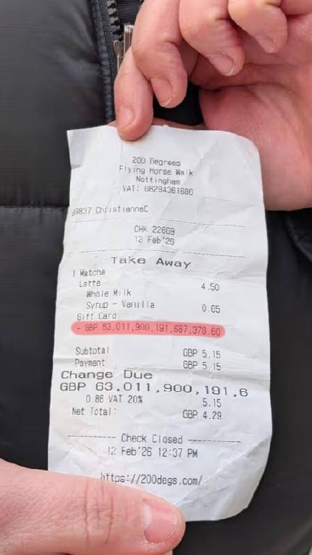 Правда, тратить своё состояние она может только на кофе и круассаны. Это бонусные баллы, которые бариста случайно занёс на счёт. Он отсканировал штрихкод, который превратился в баланс. Девушка пару раз купила кофе за бонусы, чтобы проверить — всё работает. Сумма немного уменьшилась. Формально её баланс в кофейне в 670 раз превышает объём всей мировой экономики. 📢⏩ P.S. Оставайтесь с нами и будьте в курсе всего самого интересного! 📰Подпишись на канал https://dzen.ru/id/63d7a34be120020aa9307269 #новости #мир #общество