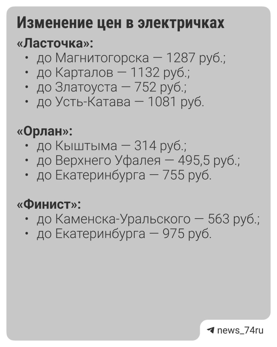 Тариф повысится с 3,49 руб./км до 3,70 руб./км. Об этом объявили «Свердловская пригородная компания» и «Башкортостанская пригородная пассажирская компания». Проезд подорожает в «Ласточках», «Орланах» и «Финистах». Как изменятся цены — в карточке ⬆️