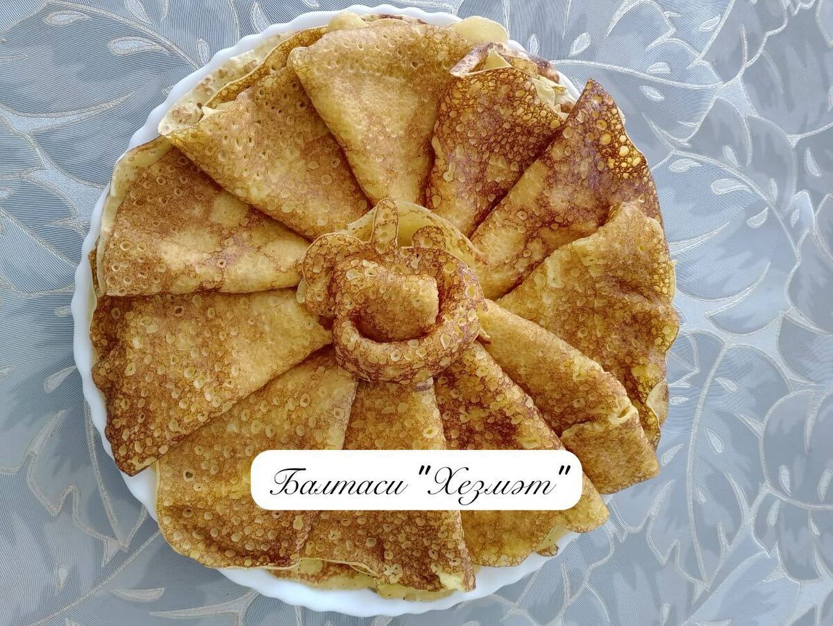 Кирәк булачак: 3 шт йомырка 1 литр сөт 0,5 литр кайнар су 450 грамм он тоз, шикәр комы тәменчә 3 аш кашыгы сыекмай Йомырка, тоз, шикәр комы, 0,5 литр сөтне яхшылап болгатабыз. Болгата-болгата он өстибез. Куе камыр барлыкка килә. Калган сөтне кушабыз һәм яхшылап болгатабыз. Аннан соң кайнар су һәм сыекмай өстәп, белен камырын ясап бетерәбез.