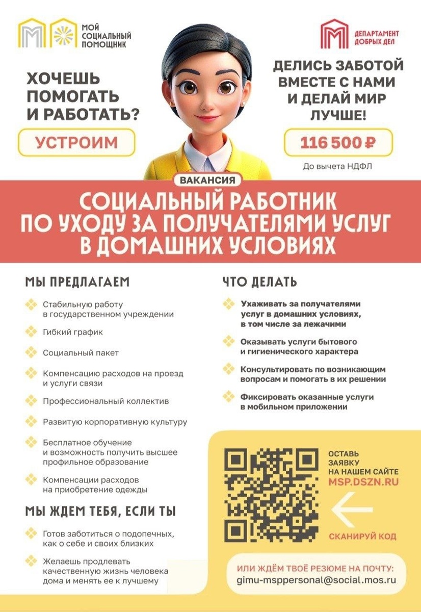 Присоединяйтесь к нашей команде! «Мой социальный помощник» расширяет команду! Мы ищем чутких и ответственных социальных работников, для которых помощь — это не просто обязанность. Идеальный кандидат — это вы, если: ✔ Умеете и любите заботиться, даря подопечным чувство безопасности и комфорта. ✔ Верите, что качественную жизнь можно и нужно продлевать в привычной домашней обстановке. 🧚♀️Суть работы: • Уход на дому (включая специализированный уход за лежачими больными). • Бытовые и гигиенические услуги. • Консультационная поддержка семей. • Работа с удобным мобильным приложением для учета. Это не просто работа — это миссия со смыслом и поддержкой сильной команды. Начните помогать уже сегодня — заполните анкету: clck.ru/3RspHu