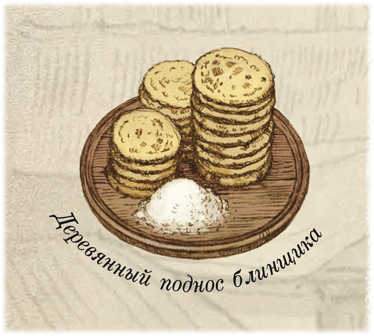 обязательный белый фартук, деревянный поднос с горкой блинов и кучкой сахарной пудры.