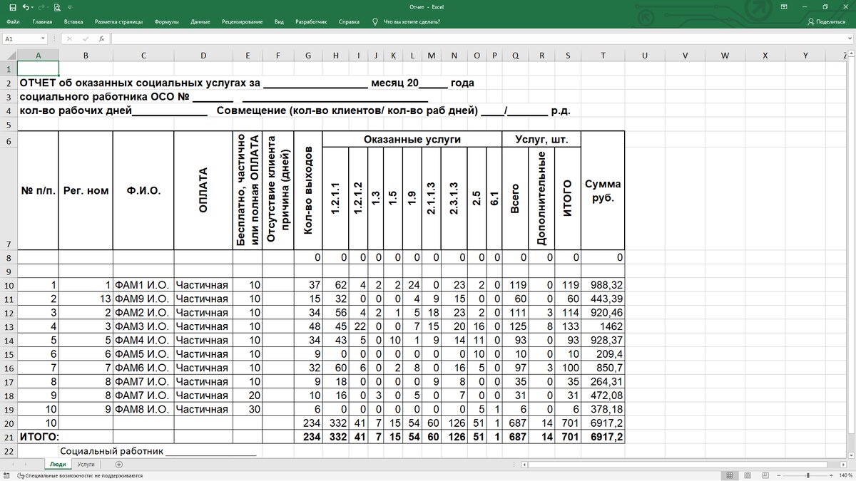 Ну вот и все. Хорошо, когда есть ограниченный набор услуг и можно в уме подсчитать все показатели и параметры и ручным способом свести в таблицу, а в будущем создать шаблон и, из месяца в месяц переписывать. А если перечень услуг меняется из месяца в месяц и увеличивается то, как быть? А если количество получателей из месяца в месяц увеличивается или уменьшается? А если есть необходимо подсчитать за большой период обслуживания и по разным видам оплат и т.д. В общем динамику обслуживания получателей (клиентов) соцработниками никто еще не отменил. Вот здесь и необходимо работать с базой данных.