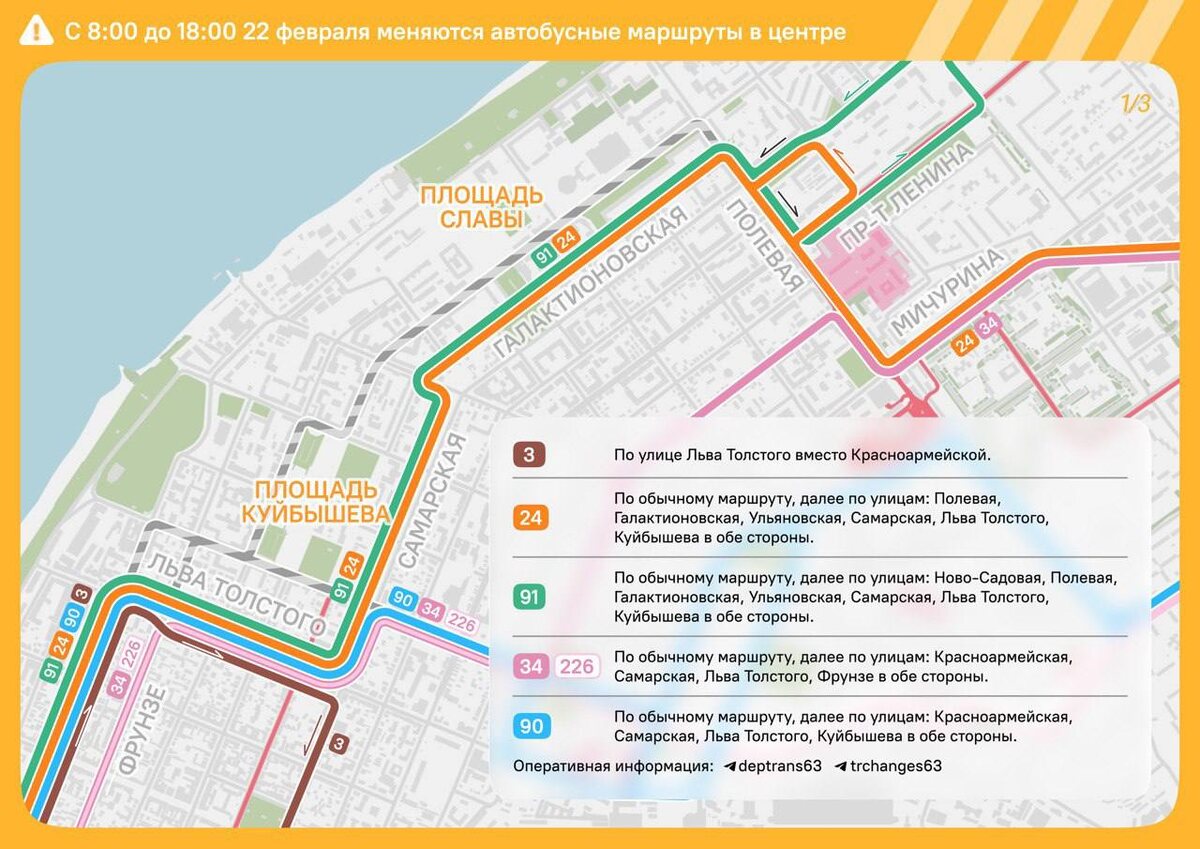 В Самаре в предстоящие выходные изменится схема движения транспорта в историческом центре. Ограничения связаны с проведением масленичных гуляний на площади имени Куйбышева. С 16:00 21 февраля до 18:00 22 февраля на ряде улиц введут запрет на остановку и стоянку автомобилей. Он затронет участки улиц Чапаевской, Шостаковича, Красноармейской, Вилоновской и Молодогвардейской. В воскресенье, 22 февраля, во время основных праздничных мероприятий с 08:00 до 18:00 движение личного транспорта, включая средства индивидуальной мобильности, в центре будет частично ограничено. Изменения коснутся тех же улиц в границах, прилегающих к площади. Автобусы № 3, 24, 34, 90, 91 и 226 в этот период будут следовать по скорректированным маршрутам. Работа трамваев сохранится в обычном режиме. Ограничения не распространяются на автомобили экстренных служб. Горожанам и гостям областной столицы рекомендуют заранее планировать маршруты и учитывать временные изменения. Фото: Департамент транспорта Самары
