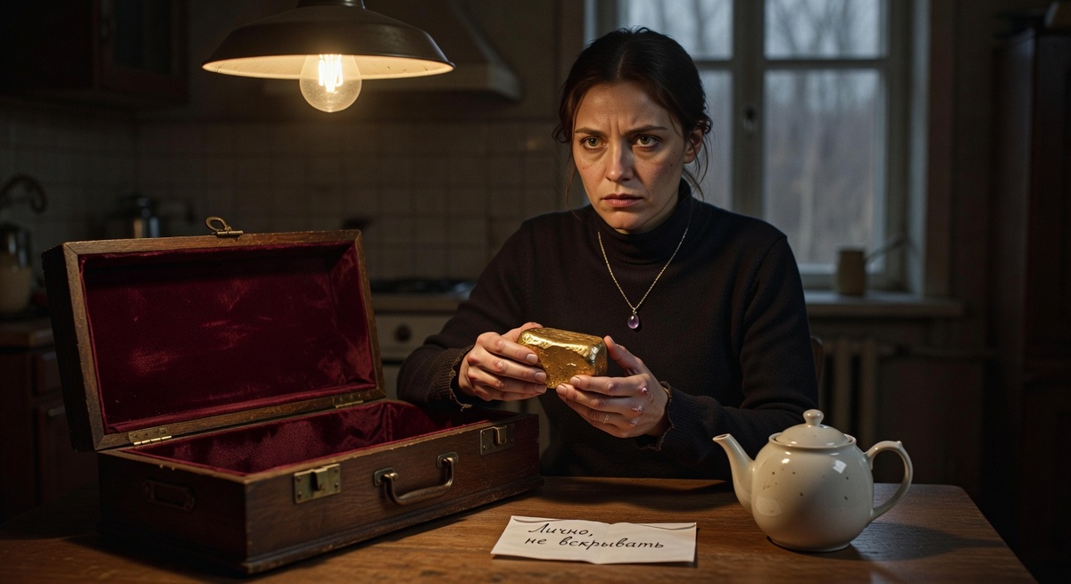 Я сидела на кухне. Чайник остыл, так и не налила. Шкатулка открыта — слиток лежал на бордовом бархате. Тяжёлый, мёртвый, тускло-жёлтый. Без единого кольца, без единой серёжки, без гравировки «З. и А. 1968».
