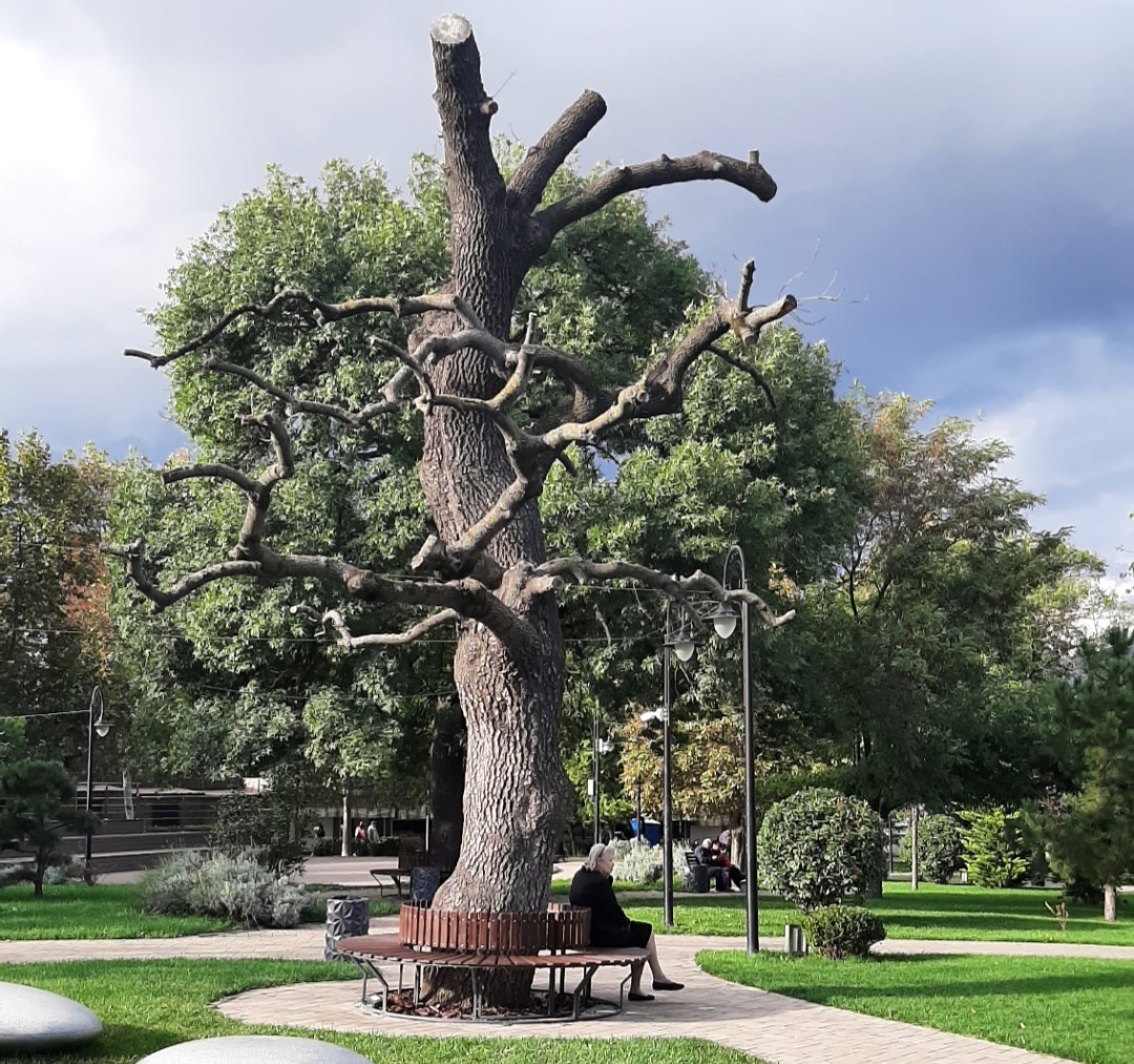 Последний образ в парке Новороссийска: пожилая женщина в парке под сухим деревом, которое еще в прошлом