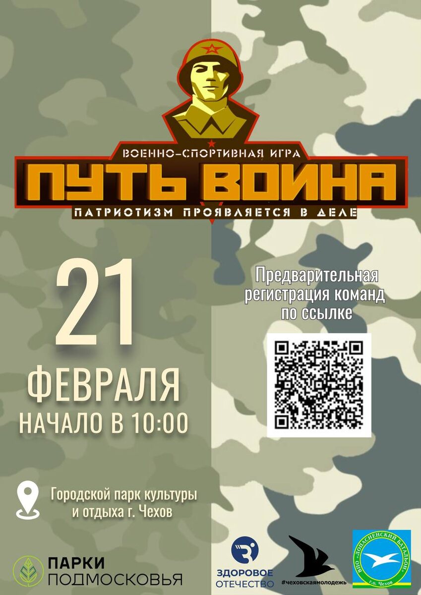 ✨ Открыта регистрация команд для участия в военно-спортивной игре ПУТЬ ВОИНА-2026! 💪🏻 Путь Воина - это традиционная игра, которая проводится с целью популяризации физического развития, воинской службы, спорта и здорового образа жизни. Участники будут соревноваться в силе, ловкости, меткости, эрудиции, оказании помощи пострадавшему и других военно-прикладных дисциплинах. 😎 Ссылка на регистрацию: https://docs.google.com/forms/d/e/1FAIpQLSfaL8ot9PxXh41pknTm0fzAPQcfav4DxdHcAVD2KtDq94Szgg/viewform?usp=header В этом году вас ждут крутые испытания. 👊 Набирайте команду, регистрируйтесь, готовьтесь, сражайтесь и побеждайте! 📆 21.02.2026 ⭐Поддержать канал голосом ✅ Мероприятия Чехов https://dzen.ru/id/66cc4b48e9ef144699238a51 http://vk.com/chekhov_events http://dzen.ru/chekhov_events