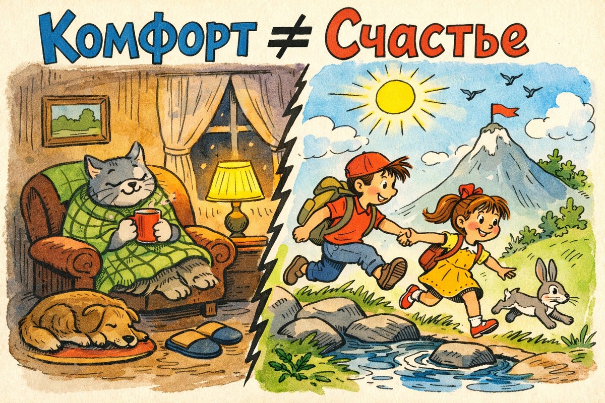 Счастье — это когда внутри горит. И это разные вещи. Мы часто путаем: если не больно, значит хорошо. Если спокойно — значит счастливо. Но спокойствие может быть просто отсутствием риска. Комфорт — это «меня не трогают». Счастье — это «я живу». В кабинете я нередко слышу: «У меня всё нормально. Работа стабильная, отношения ровные. Но радости нет». И это честно. Комфорт — про безопасность. Счастье — про смысл. Про движение. Про выбор, который иногда пугает. Комфорт любит повторяемость. Счастье требует смелости. Комфорт шепчет: «Оставайся, здесь привычно». Счастье спрашивает: «А это точно твоё?» Иногда, чтобы стать счастливее, приходится выйти из удобного. Поговорить, где молчал. Уйти, где терпел. Начать, где откладывал. Комфорт сохраняет. Счастье развивает. И главный вопрос не в том, удобно ли вам сейчас. А в том, живёте ли вы свою жизнь — или просто аккуратно в ней устроились. #комфорт #счастье