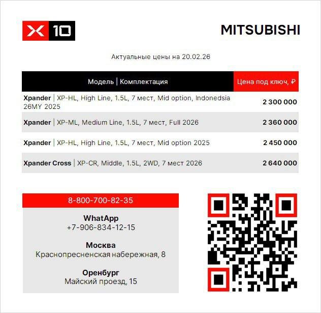 🟢Обзор комплектации Cross 2026 MY 🟢Обзор комплектации High Line 2025 🤑 Цены указаны с учётом растаможки и доставки в Москву Поможем определиться с выбором и расскажем все детали — обращайтесь к менеджерам: 📞 +7(800)700-82-35 бесплатно по РФ 📞 +7(919)868-97-47 Иван 📞 +7(922)856-66-66 Сергей (авто из Кыргызстана) 💬 MAX 💬 Telegram 💙 Сообщество в VK 🖥 Сайт 📍Оренбург, проезд Майский, 15 📍Москва, Краснопресненская набережная, 8 #x10прайс #mitsubishixpander
