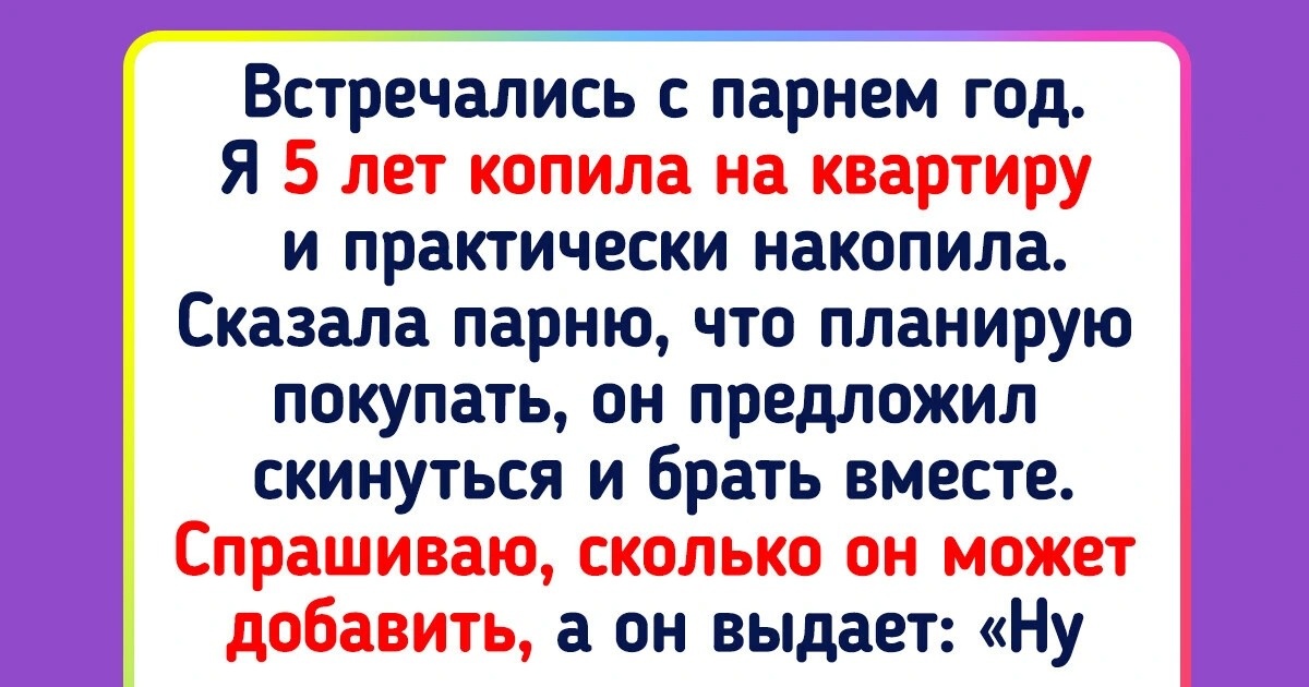 Встречались с парнем год. Я последние 5 лет копила на квартиру и практически накопила. Сказала ему, что планирую покупать квартиру, он предложил добавить и купить совместно. Спросила, сколько он может добавить, а тот выдал: «Ну у меня 153 тысячи есть». Я чуть не упала! Решила, что займу у коллеги и сама куплю. Так и сделала. После этого парень мне мозг вынес, мол, я замуж хотел тебя позвать, а ты так некрасиво поступила. При этом не забывает всем рассказывать, что мы купили квартиру. Мы будем переезжать скоро. А я вообще не понимаю, откуда взялись эти «мы». Смешной.