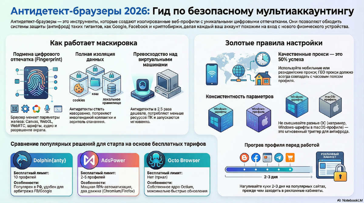 Экспертное заключение: Выбор инструмента зависит от масштаба и задач. Для старта с нулевым бюджетом оптимален Dolphin{anty} или Undetectable. Для работы с TikTok безальтернативен GeeLark. Однако для серьезных команд, где стоимость одного аккаунта может превышать $500, инвестиция в Octo Browser или Multilogin — это вопрос сохранности капитала. В 2026 году успех мультиаккаунтинга — это не искусство скрываться, а инженерная точность в создании «цифрового двойника», который не отличим от обычного пользователя.