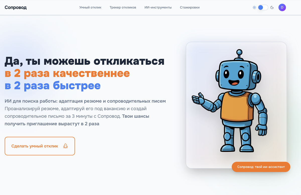 Средний соискатель получает ответ на каждый 5-й отклик. Это 20% конверсия — и многие считают это нормой. Покажу как Сопровод меняет эту математику через полный цикл работы с вакансией. Типичный процесс: нашел вакансию, нажал "откликнуться", отправил резюме. Иногда добавил сопроводительное письмо — одно и то же на все вакансии. Проблема в том что каждая вакансия — отдельная задача. У бухгалтера в МФО и бухгалтера в IT-стартапе разные приоритеты, разный язык, разные ключевые слова. Одно резюме не попадает ни в одну из них точно. Анализ 500+ откликов через Сопровод показал: персонализированный отклик с адаптированным резюме и письмом под конкретную вакансию дает конверсию в ответ в 2-3 раза выше чем стандартный. Шаг 1: Анализ вакансии. Вставляешь текст — ИИ вычленяет требования и сортирует по весу. Сразу видишь что критично, а что желательно. Шаг 2: Интервью с ИИ-ассистентом. Сервис задает точечные вопросы под требования которых не нашел в резюме. Не выдумывает — вытаскивает реальный оп