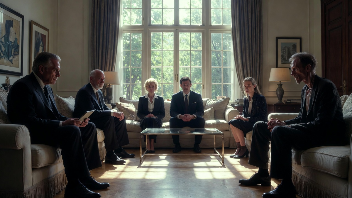 Через десять минут к дому подъехал чёрный внедорожник с тонированными стёклами. Из него вышли трое: мужчина лет пятидесяти в строгом костюме, с лицом человека, привыкшего принимать решения; молодая женщина с планшетом, похожая на учёного-исследователя; и ещё один мужчина, помоложе, с аккуратной бородкой и внимательными глазами — типичный юрист или адвокат.