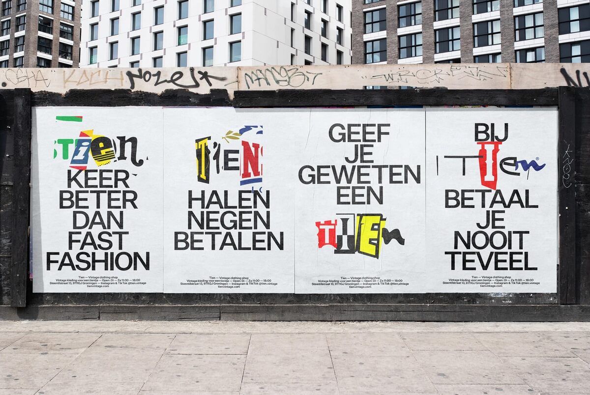 В Нидерландах магазин подержанной одежды Tien сделал основной идеей своего ребрендинга философию повторного использования. «Наш ребрендинг исходит из понимания, что миру не нужно больше вещей, а лишь лучшее использование того, что уже есть», — говорят авторы концепции. Поэтому логотип Tien стал коллажем из букв, взятых из известных брендов, найденных среди гор выброшенной одежды. Новая айдентика включает более 70 существующих логотипов, каждый из которых предоставляет хотя бы одну из четырех букв названия Tien. Это позволяет создать более трех миллионов различных вариантов эмблемы магазина. Визуальный стиль дополняется шрифтом Untitled Sans Medium от Klim Type Foundry, установленным в насыщенном черном на белом и светло-сером фоне. Такой подход, по словам авторов, подчеркивает функциональность и минимализм дизайна. В рамках проекта переработаны не только известные логотипы, но и слоганы. Так получились, к примеру, «Just do Tien» и «The Intelligent Choice. Tien». Даже вывески в магазине