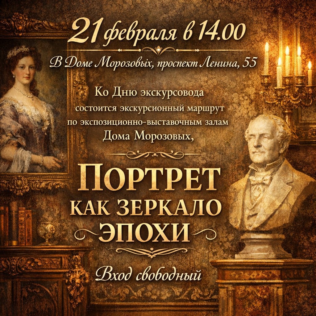 ✨ Экскурсия по выставочным залам музея. 👉Тема экскурсии «Портрет как зеркало эпохи» 👀Как выглядели люди прошлых столетий? Что скрывается за их взглядами, позами и одеждой? ⌛️ Через портреты выдающихся личностей вы узнаете о ключевых исторических событиях, культурных традициях, власти, идеалах разных эпох. 📌 Количество мест ограничено 📞 Предварительная запись по телефону: 8 (4967) 69-92-39 🚫 Возраст: 6+ 📆 21.02.2026 🕒 14:00 🏢 Музей-заповедник «Подолье» - Дом Морозовых 📍 г. Подольск, пр-т Ленина, д.55 ⭐Поддержать канал голосом 🍰Где поесть в Подольске ✅ Мероприятия Подольск https://dzen.ru/id/66ed500f7b5671493eca3fd6 http://vk.com/podolsk_events http://dzen.ru/podolsk_events