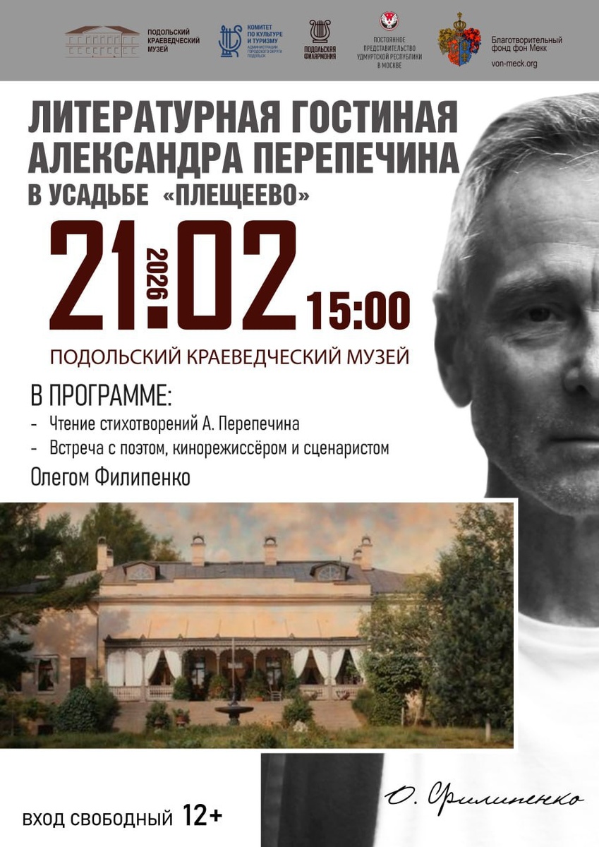✨ Чтение стихотворений Александра Перепечина и встреча с поэтом, кинорежиссёром и сценаристом Олегом Филипенко 🚫 Возраст: 12+ 📆 21.02.2026 🕒 15:00 🏢 Подольский краеведческий музей 📍 г. Подольск, Советская площадь, д.7 💰 Вход свободный❗️ ⭐Поддержать канал голосом 🍰Где поесть в Подольске ✅ Мероприятия Подольск https://dzen.ru/id/66ed500f7b5671493eca3fd6 http://vk.com/podolsk_events http://dzen.ru/podolsk_events