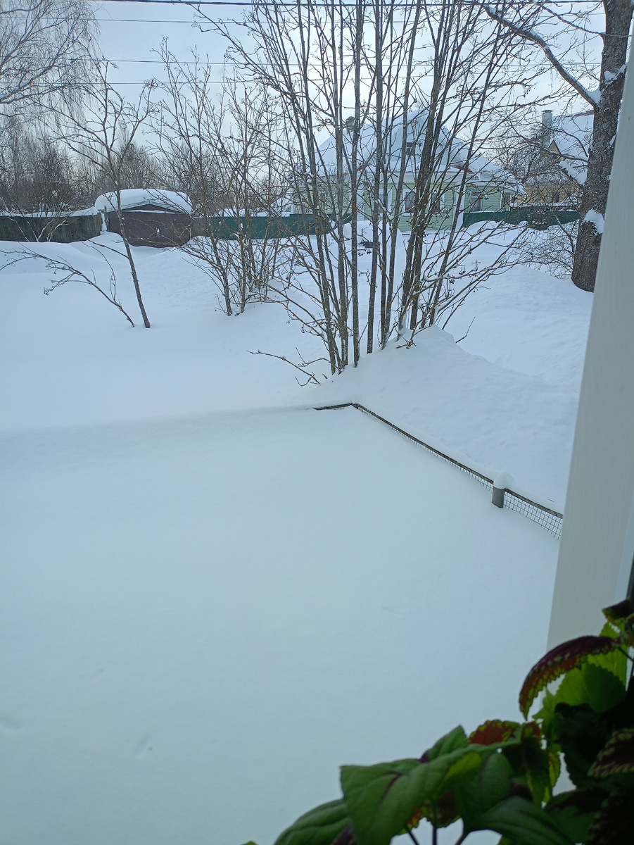 Во дворе прочищена только тропинка. А снег опять идет крупными хлопьями. После обеда нужно выходить и чистить снег за воротами, иначе муж завтра не подъедет к гаражу.