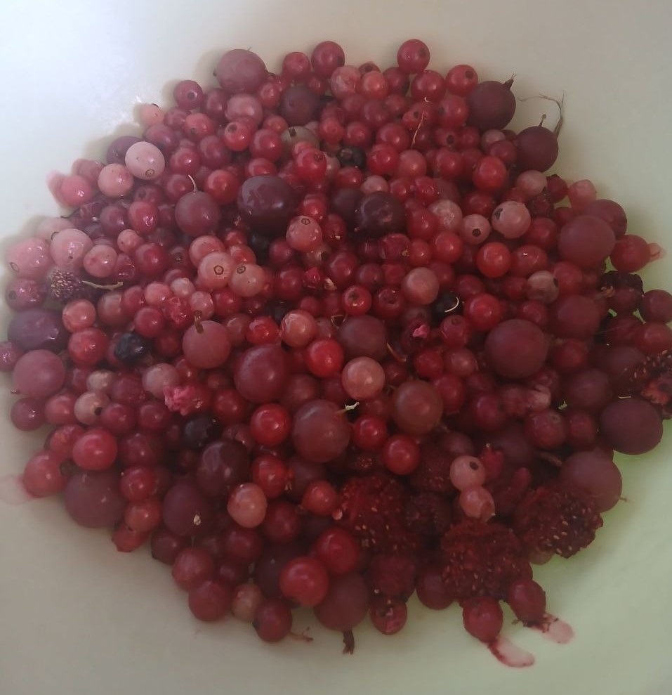 С подачи своей сестры с этого года я готовлю «живой» морс, т.е. ягоды теперь не варю. Алгоритм простой. Беру около 500 гр замороженных ягод, размораживаю. Обычно я их достаю из морозильника вечером, а утром готовлю. Ягоды свои, в основном смесь красной и белой смородины, крыжовника, иногда добавляю немножко клубники. В размороженные ягоды добавляю фруктозу, уже знаю сколько, и пюрирую погружным блендером. Наливаю воду 1.2 л из своего фильтра-кувшина, все хорошо перемешиваю. Вы в первый раз добавляйте сахар после воды, узнаете вашу потребность. Далее совсем просто, сначала в ход идет дуршлаг, он освобождает наш морс от шкурок. Второе процеживание через сито, уходят семена. Морс готов. На выходе около 1.1 л. вкусного натурального напитка. Он с мякотью, можно еще сверху снять пенку, но без энтузиазма. Перед тем, как налить, перемешиваю. Сначала может показаться, что долго. Но, это ошибочно. Привыкаете быстро, а пользы ПУД!!!
