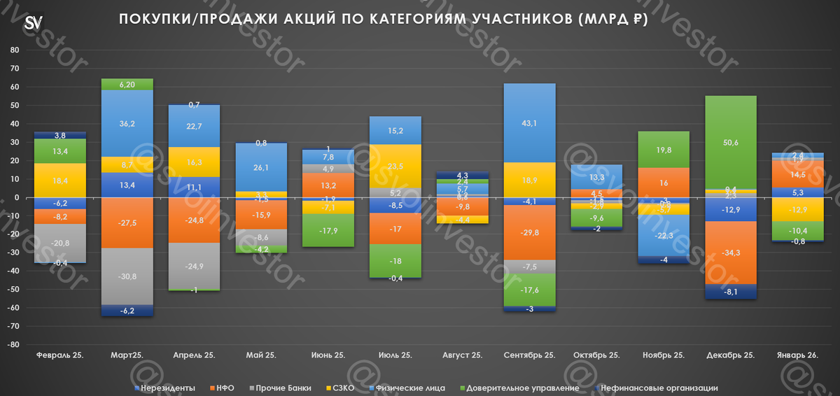 Давайте взглянем на интересности из отчёта: 🏛 Акции: 💬 По итогам декабря-января IMOEX вырос на 4%, составив 2783 пункта (геополитика). Среднедневной объём торгов акциями в январе увеличился до 99₽ млрд (в декабре — 88₽ млрд, в ноябре — 92₽ млрд), стоит отметить, что среднедневной за 2025 г. составил 122₽ млрд. 💬 Основными покупателями на российском рынке акций в декабре стали НФО ДУ — 50,6₽ млрд (в ноябре — 19,8₽ млрд), в январе НФО — 14,5₽ млрд (в декабре продали на 34,3₽ млрд). Основными продавцами на российском рынке акций в декабре стали НФО — 34,3₽ млрд (в ноябре купили на 10,5₽ млрд), в январе СЗКО — 12,9₽ млрд (в декабре купили на 1,9₽ млрд). Физики же делали некрупные покупки — в декабре 0,4₽ млрд, в январе 2,4₽ млрд (в ноябре продали на 22,3₽ млрд). 💬 Нерезиденты из дружественных стран в декабре продали акций на 12,9₽ млрд (похоже нашли лазейку), но в январе принялись к покупкам на 5,3₽ млрд. 💵💴 Валюта: 💬 В декабре-январе ₽ укрепился к $ до 75,73₽ (-3,2% м/м), а к ¥ до