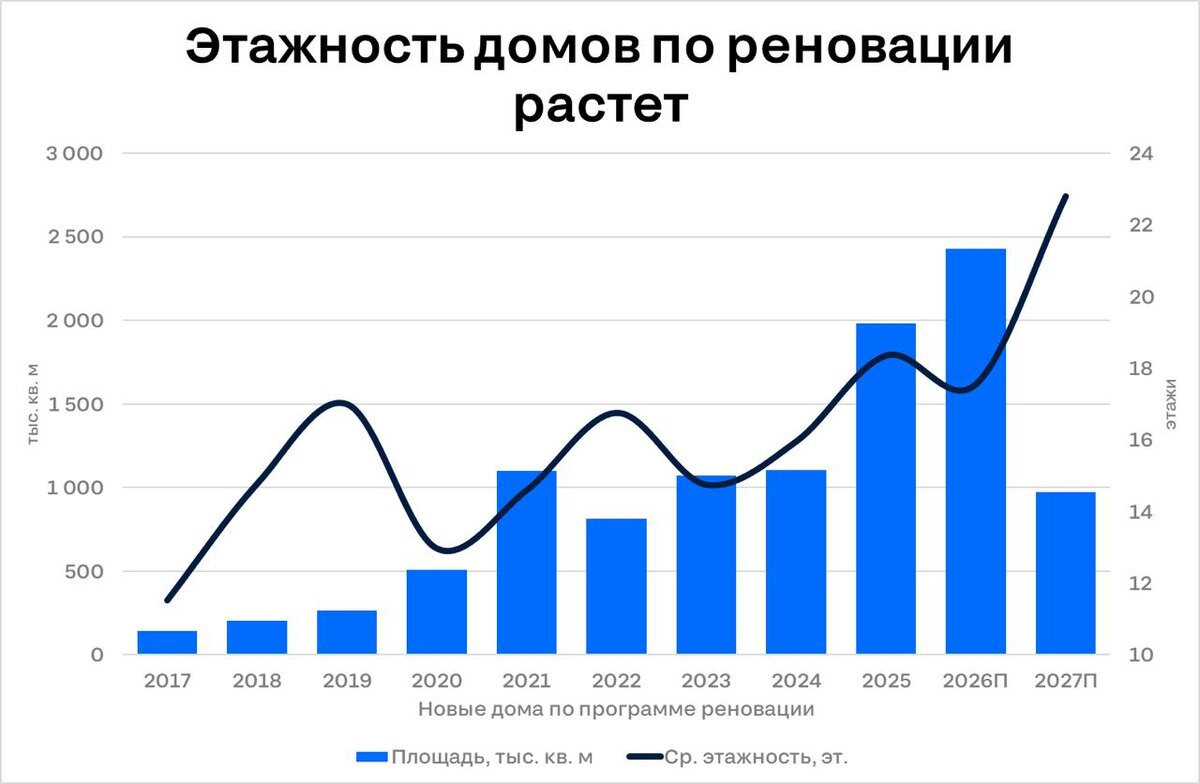 За 8 лет по программе реновации в Москва построено почти 500 домов общей площадью свыше 7 млн м². 🔵В первые годы на такие проекты приходилось менее 6% от общего ввода жилья, то по итогам 2025 года показатель приблизился к 30%. В ближайшие три года планируется сдать еще 3,5 млн м².