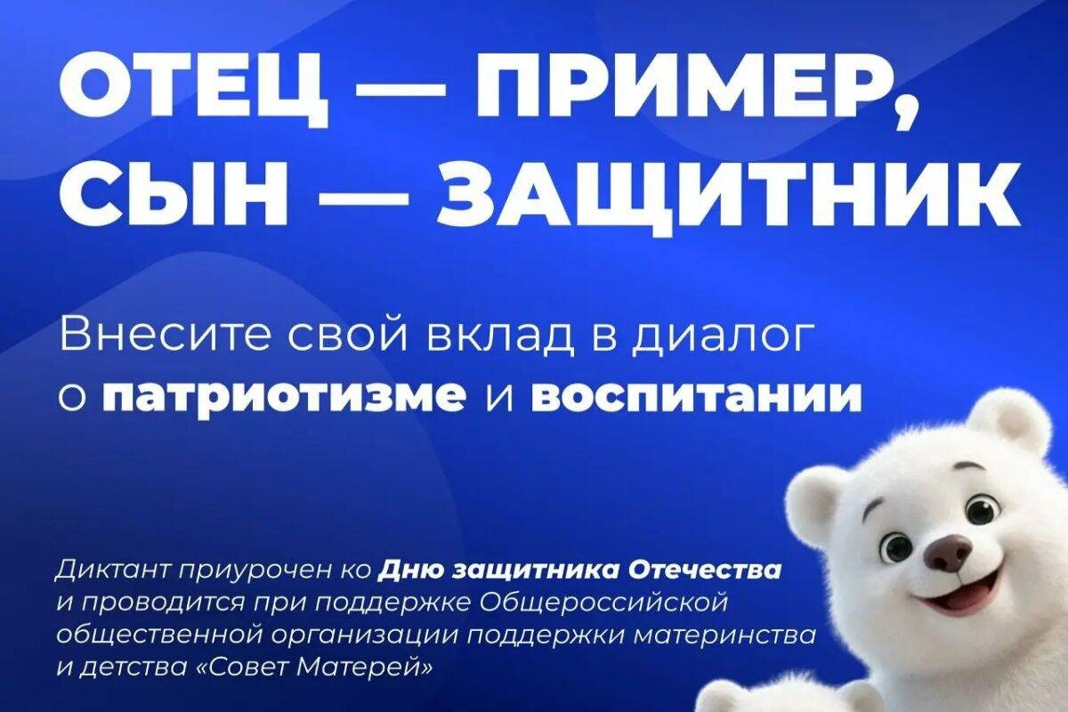 детства «Совет Матерей» стартовал онлайн-диктант «Отец – пример, сын – защитник» Проведение онлайн-диктанта приурочено ко Дню защитника Отечества и призвано подчеркнуть неразрывную связь между поколениями, а также роль мужчины как фундамента традиционной российской семьи. Диктант охватывает важнейшие аспекты ответственного отцовства, становления личности мальчика и формирования гражданской идентичности у подрастающего поколения через призму традиционных семейных ценностей. Пройти онлайн‑диктант можно до 2 марта 2026 года по ссылке: https://7ya.er.ru/dictation