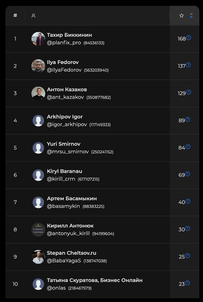 : https://client.chatkeeper.app/chat/-1002098475786/reputation/ Когда-то, я отвечал от имени своего текущего канала. А еще от имени канала “ПИП”, что давало мне 91 отзыв дополнительно, но в какой-то момент все каналы были подчищены, остались только персональные учетки. Ставлю себе целью за год опять выйти на первое место в рейтинге. Можете помочь мне и сказать спасибо в ответ на любое мое сообщение там в группе 😅
