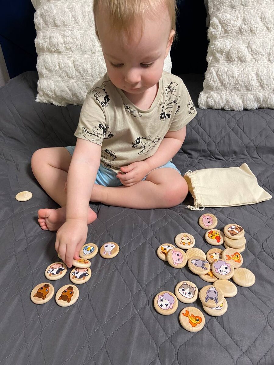 !😍 Это деревянная игра "Меморики: домашние животные", которую можно использовать многофункционально. Сейчас — искать пару, повторять звукоподражание, а когда малыш подрастёт, можно будет провести занятие "В деревне" (кто где живёт, какая польза человеку от домашнего скота и других животных, как за ними ухаживать, что они едят, как называются детёныши). Игра одна, а вариаций на разный возраст — море! Такое я обожаю. Чем ещё привлекла игра: 🟡 деревянные изделия высокого качества (без заноз и облезлой краски); 🟡 реалистичная и приятная прорисовка зверей (не мультяшные, а реальные, узнаваемые и очень симпатичные); 🟡 компактность: мешочек и небольшая коробочка; 🟡 небольшие, но удобные для детской руки фишки (их невозможно проглотить, они безопасны); 🟡 кр-код с инструкцией, как можно играть — не надо ломать голову и специально что-то придумывать; 🟡 можно развивать моторику (захват, перекладывание) и высшие психические функции (внимание, память, речь, мышление). А для вас ещё одна