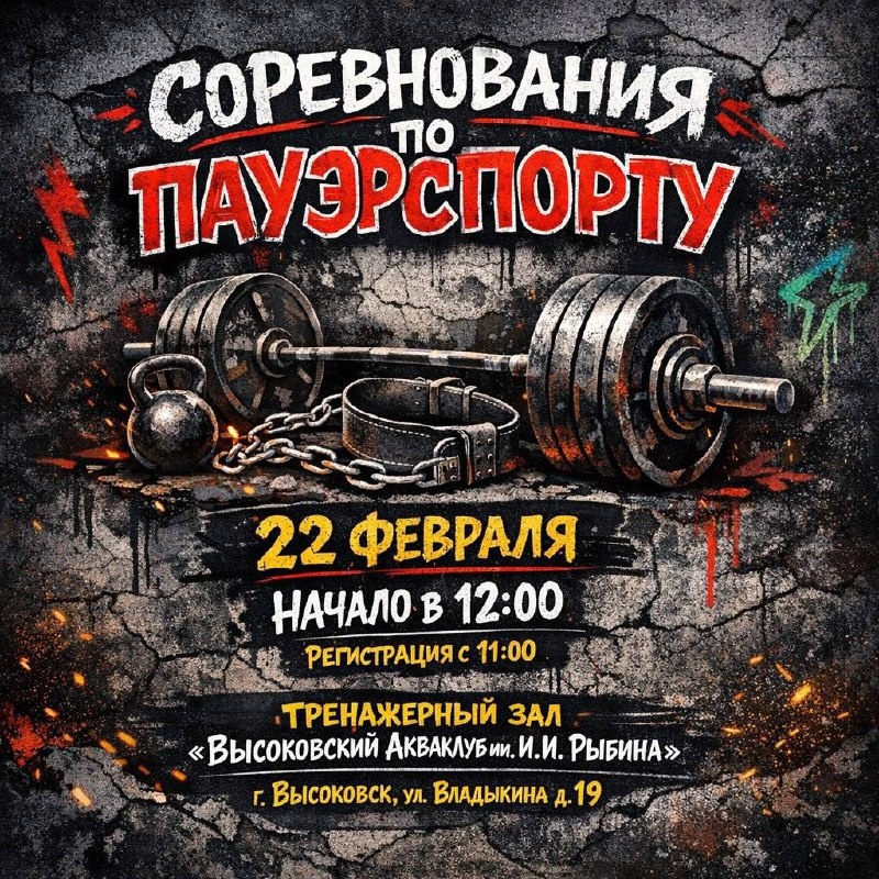 🤩🤩🤩🤩🤩🤩 💪Внимание, любители силового спорта! Приглашаем всех желающих принять участие в соревнованиях по пауэрспорту! 📆2️⃣2️⃣ февраля ⏰1️⃣1️⃣⏺️0️⃣0️⃣ ⚡️Начало соревнований: 1️⃣2️⃣⏺️0️⃣0️⃣ 📍Тренажерный зал «Высоковский Акваклуб им. И.И. Рыбина» 🏛г. Высоковск, ул. Владыкина, д. 19 ☎️8-925-628-31-15 Максим Владимирович 🤩 МЫ В ВК | 🤩 МЫ В MAX #клин #клинзвучит #молодежноеТВ