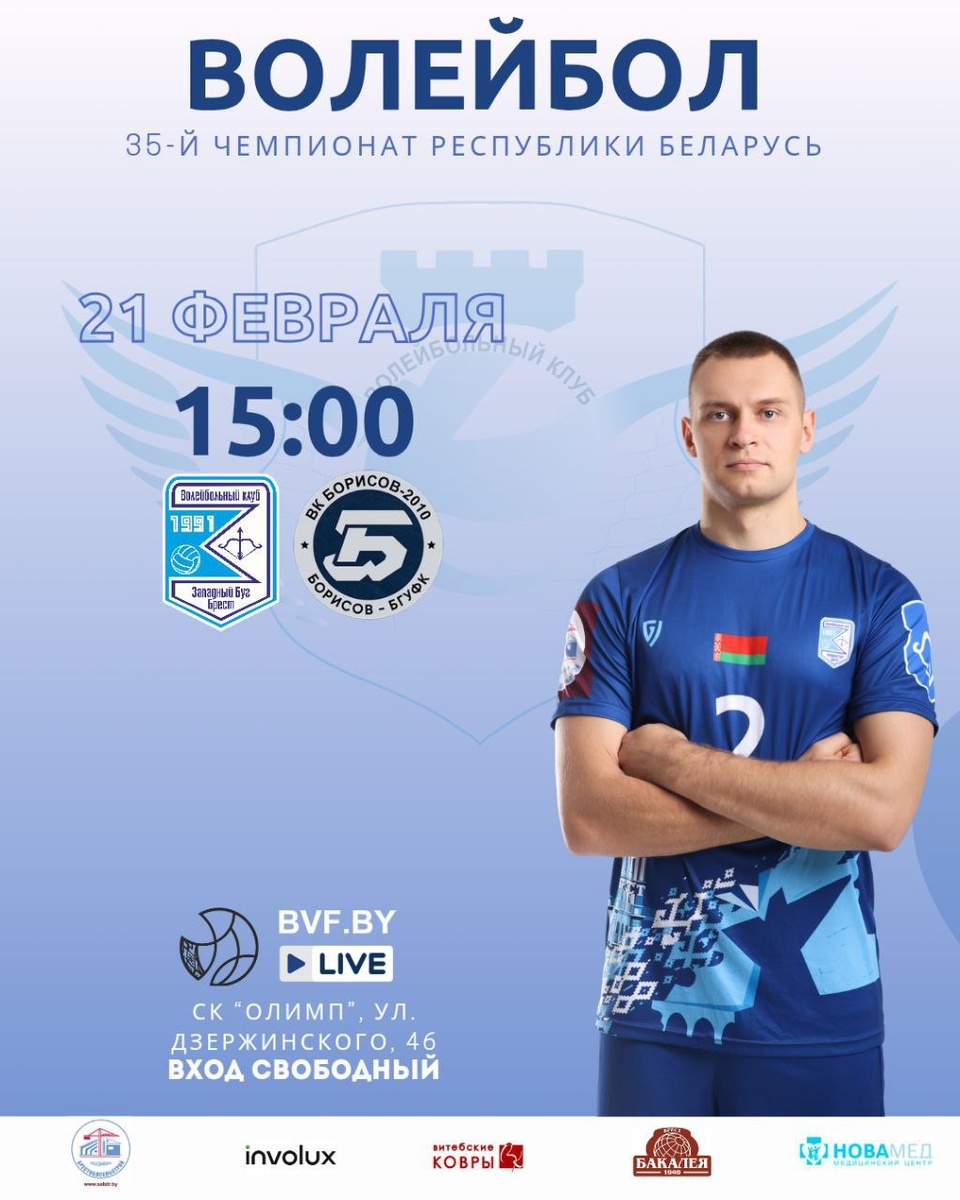 ! Любители спорта, это событие нельзя пропустить! В ближайшую субботу наш «Западный Буг» сойдётся в поединке с командой «Борисов-БГУФК». 🔥 Главная интрига матча: В составе наших соперников на брестский паркет выйдет настоящая легенда — Алексей Обмочаев! 🥈 Заслуженный мастер спорта; 🥇 Чемпион Олимпиады-2012 в Лондоне (в составе сборной России). 📍 Где: СК «Олимп» (г. Брест, ул. Дзержинского, 46). 📅 Когда: 21 февраля (суббота). 🕒 Начало: 15:00. Приходите всей семьей зарядиться энергией победы и поддержать своих! Вход свободный.