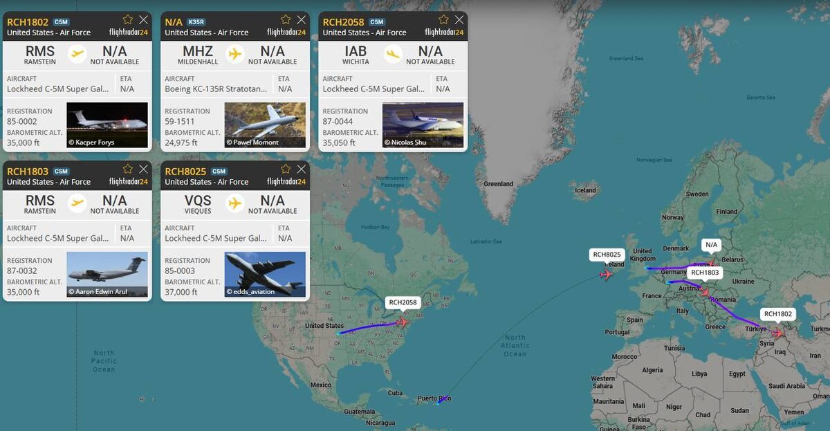 ❗️🗺Очень необычно: сразу три тяжелых стратегических военно-транспортных самолета ВВС США C-5M в настоящее время находятся в воздухе