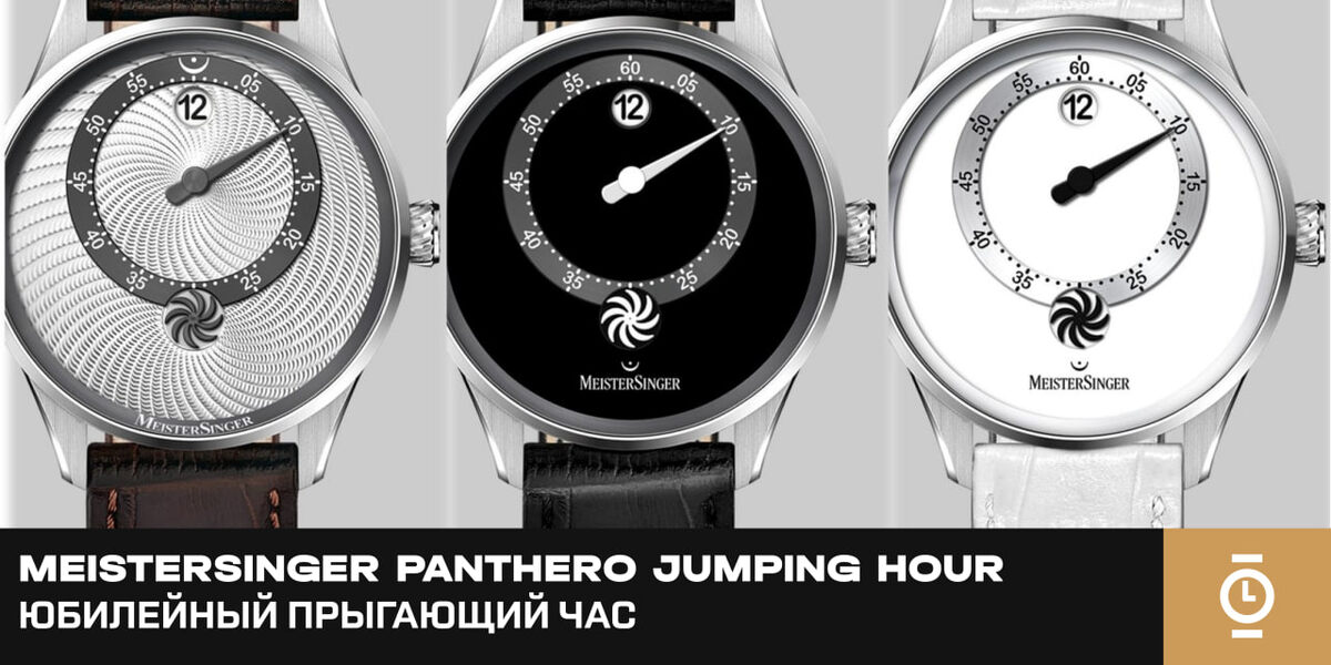 #новости_WD Немецкая марка MeisterSinger отмечает 25-летие выпуском Panthero Jumping Hour — модели с прыгающим цифровым часом и традиционной минутной стрелкой. Новинка выходит в трёх версиях: лимитированной серии и двух вариантах постоянной коллекции. Главная особенность — сочетание фирменной однострелочной концепции с цифровым индикатором часа. В круглой апертуре на «12 часах» отображается текущий час, который мгновенно перескакивает при смене. Минутная стрелка совершает полный оборот за 60 минут по смещённому кольцу минутной шкалы, создавая эффект глубины и многослойности циферблата. На «6 часах» расположен вращающийся элемент в форме солнечного креста — древнего символа вечности. Он делает полный оборот каждую минуту, визуализируя непрерывное течение времени, но не измеряя его. А под ним — логотип бренда в виде ферматы. Внутри установлен калибр MS-JH-01 на базе Sellita SW300 с дополнительным модулем прыгающего часа. Через прозрачную заднюю крышку виден ротор, стилизованный под т