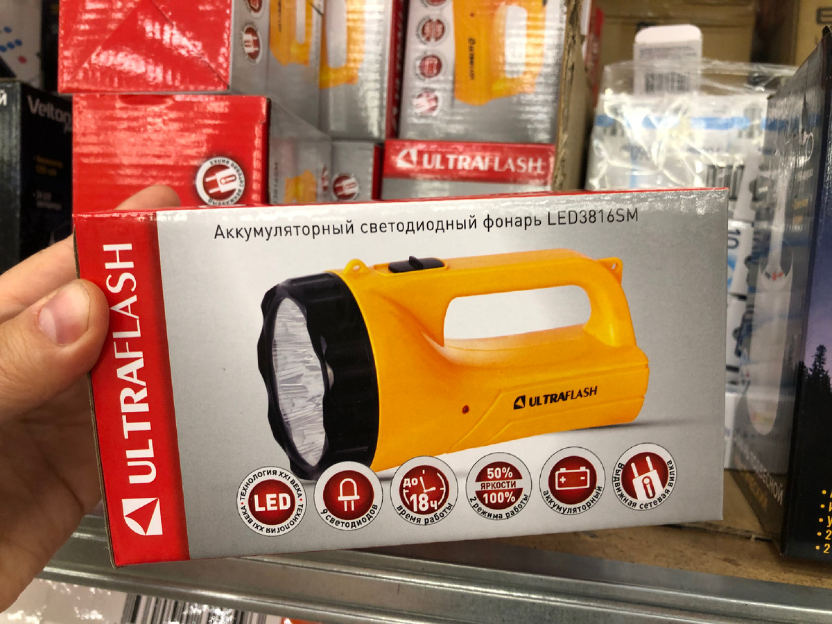В продаже появились аккумуляторные фонари. Фонарь светодиодный. 9 светодиодов. Время работы на полном заряде до 18 часов. 2 режима свечения: ближний и дальний свет. Удобная ручка. Имеется выдвижная вилка для зарядки. Изготовитель Китай. Цена 483 рубля.