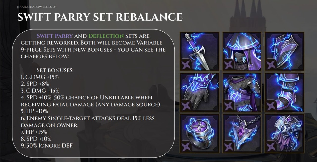 В версии 11.30 награды за попадание в платиновую лигу классической арены, полученные за 500, 20 и 3 лучших игроков, претерпят значительные изменения в балансе. В этих сундуках теперь будут находиться аксессуары эпической, легендарной и мифической редкости, мифические артефакты, 12 новых аватаров (по 4 на каждый сундук) и 2 новые рамки для аватаров (для сундуков из топ-500 и топ-20). Сеты «Парирование» и «Отражение» будут переработаны. Оба станут наборами из 9 предметов. Парирование: 1. Крит.урон +15% 2. Скорость +8% 3. Крит.урон +15% 4. Скорость +10%. 50% шанс получить неуязвимость при получении смертельного урона (от любого источника урона). 5. ХП +10% 6. Атаки противника по одной цели наносят на 15% меньше урона владельцу. 7. ХП +15% 8. Скорость +10% 9. 50% игнор защиты Отражение: 1. Метк +20 2. Скорость +10% 3. Метк +20 4. 35% шанс отразить 1 штраф обратно в атакующего. Накладывает Блок штрафов на 1 ход в начале раунда. 5. Скорость +10% 6. Владелец наносит дополнительный урон, п