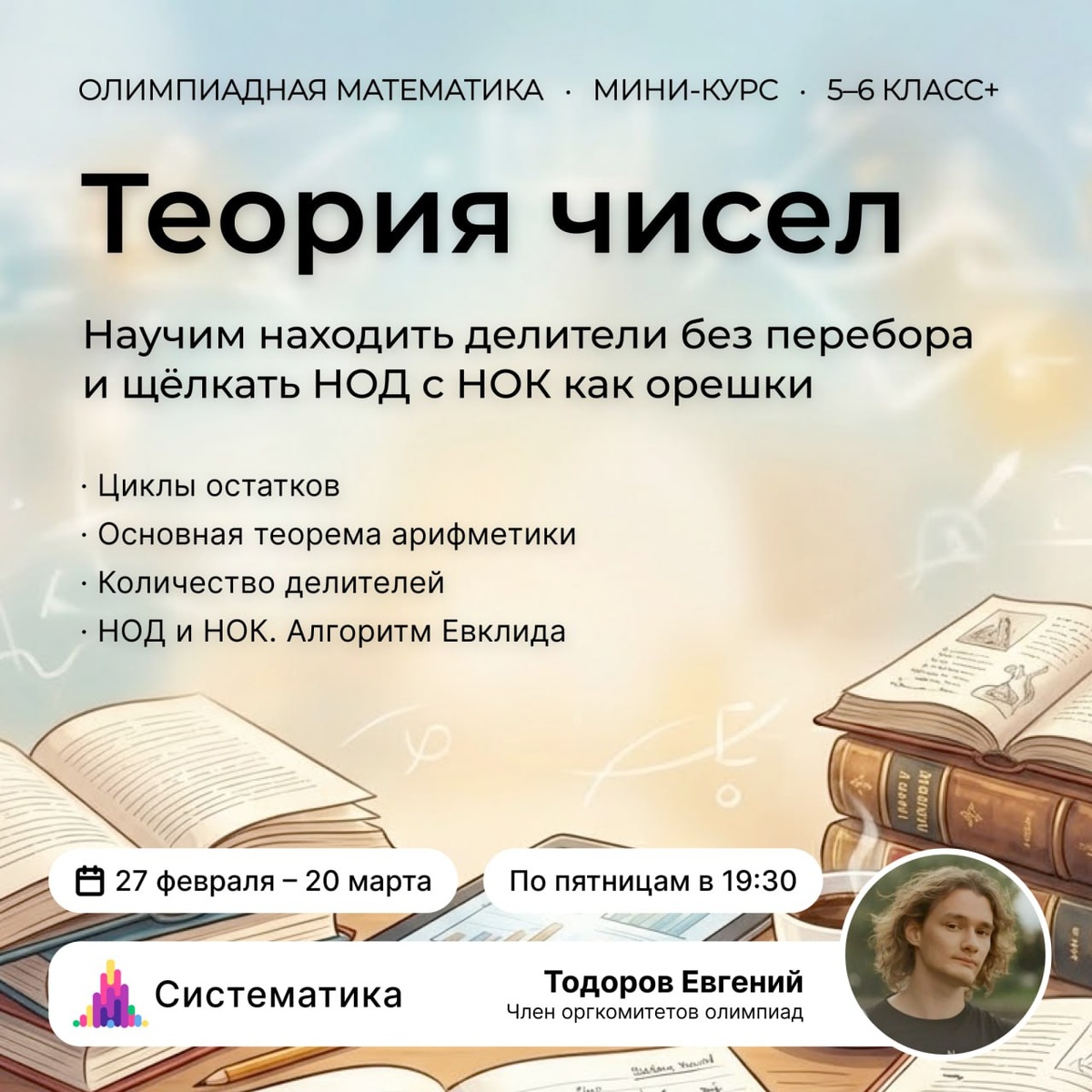 ? Тогда приглашаем на курс «Теория чисел» по олимпиадной математике для 5-6 классов! Научим, как узнавать последнюю цифру любого числа за секунду, находить делители без перебора и щёлкать НОД с НОК как орешки. ✅ 27 февраля — 20 марта • 4 занятия по 60 минут • По пятницам в 19:30 (мск) На курсе мы: • Разберём, из чего «состоят» числа • Освоим алгоритм Евклида, разложение на множители, циклы остатков • Научимся быстро считать делители • Освоим доказательный подход к решению задач по теории чисел Как проходят занятия? • Онлайн: 20% теории, 80% практики • Доступно в записи, если пропустили • Поддержка куратора, ответы на вопросы, проверка домашних заданий и подсказки • Сертификат в конце курса В результате: • Научимся работать с делимостью, остатками, НОД и НОК • Получим навык анализа чисел без перебора и ошибок • Освоим олимпиадную базу для 5–6 классов Ведущий и автор курса — Евгений Тодоров — с 2016 года преподает олимпиадную математику и дополнительные разделы в частных и государ